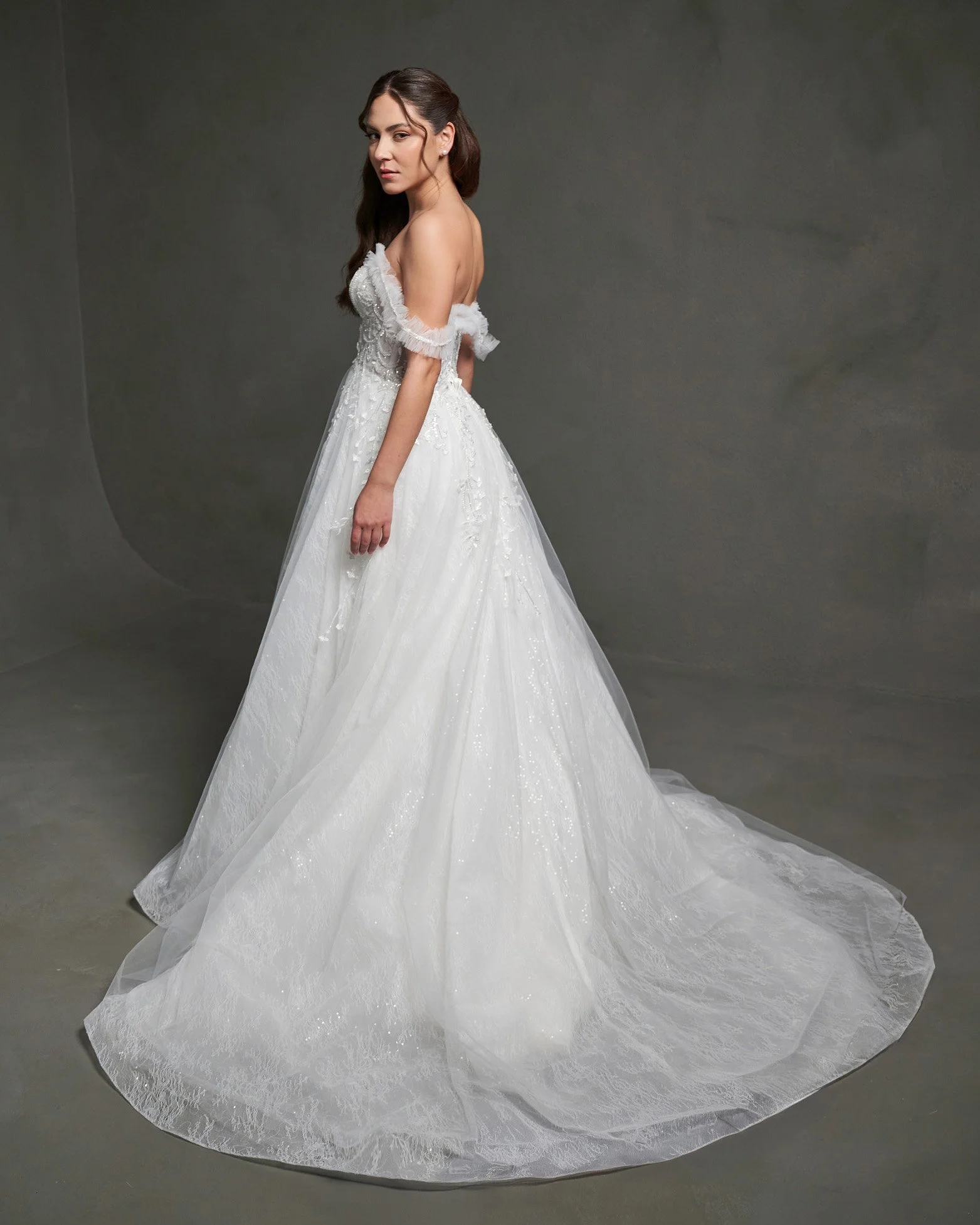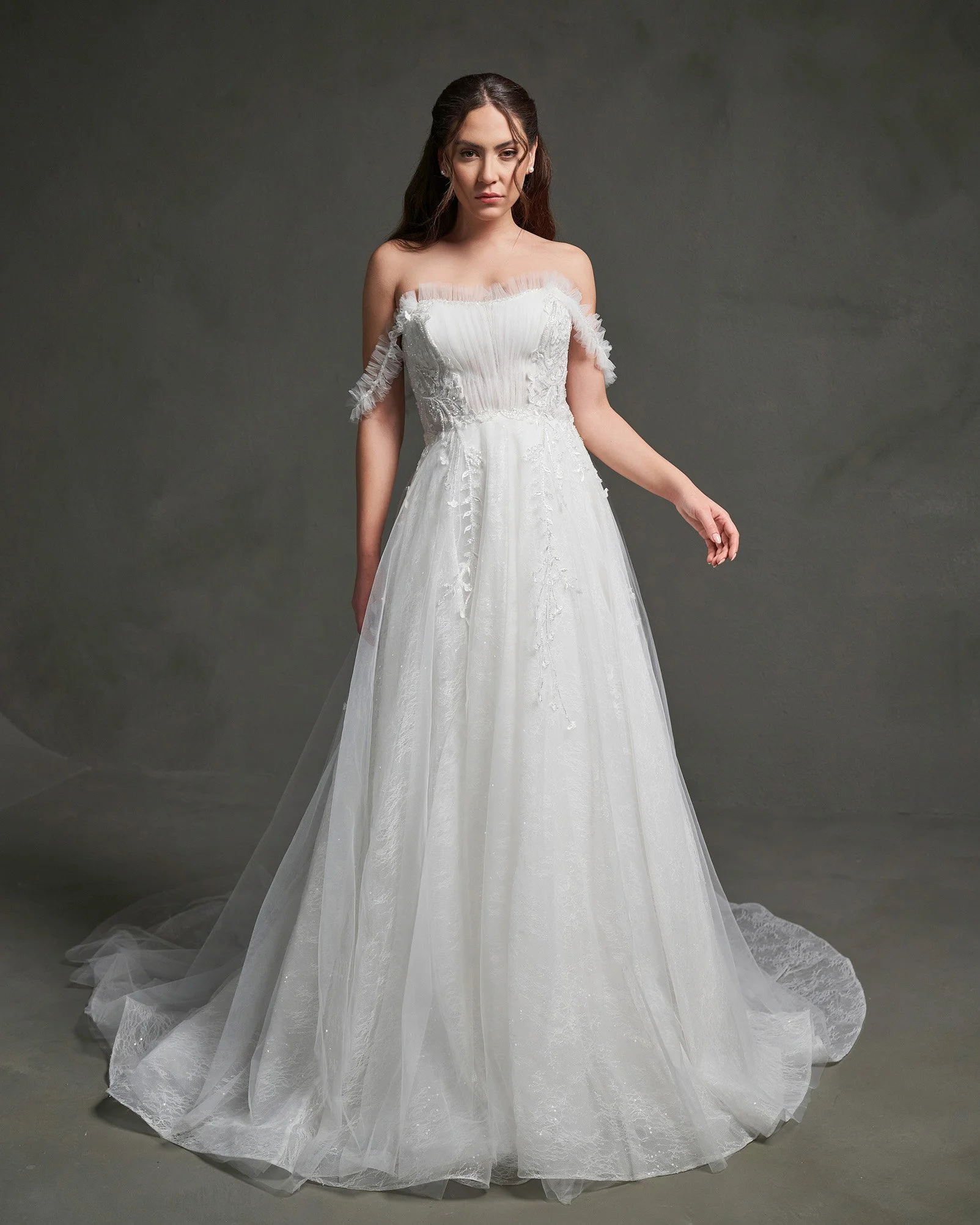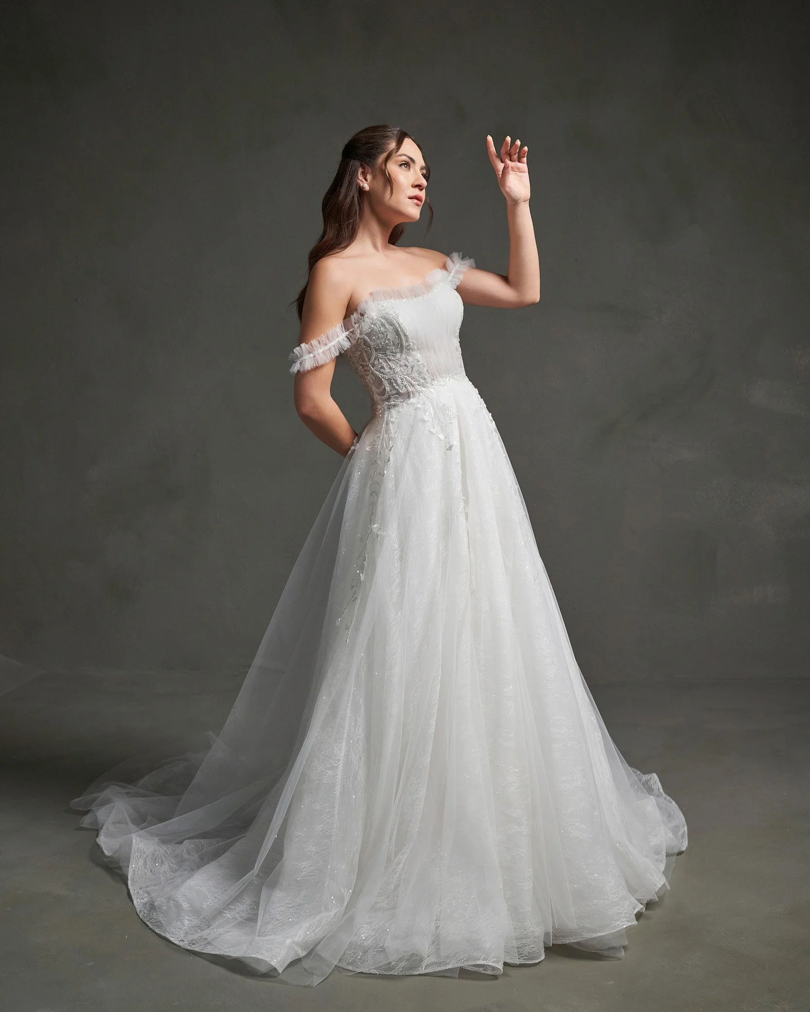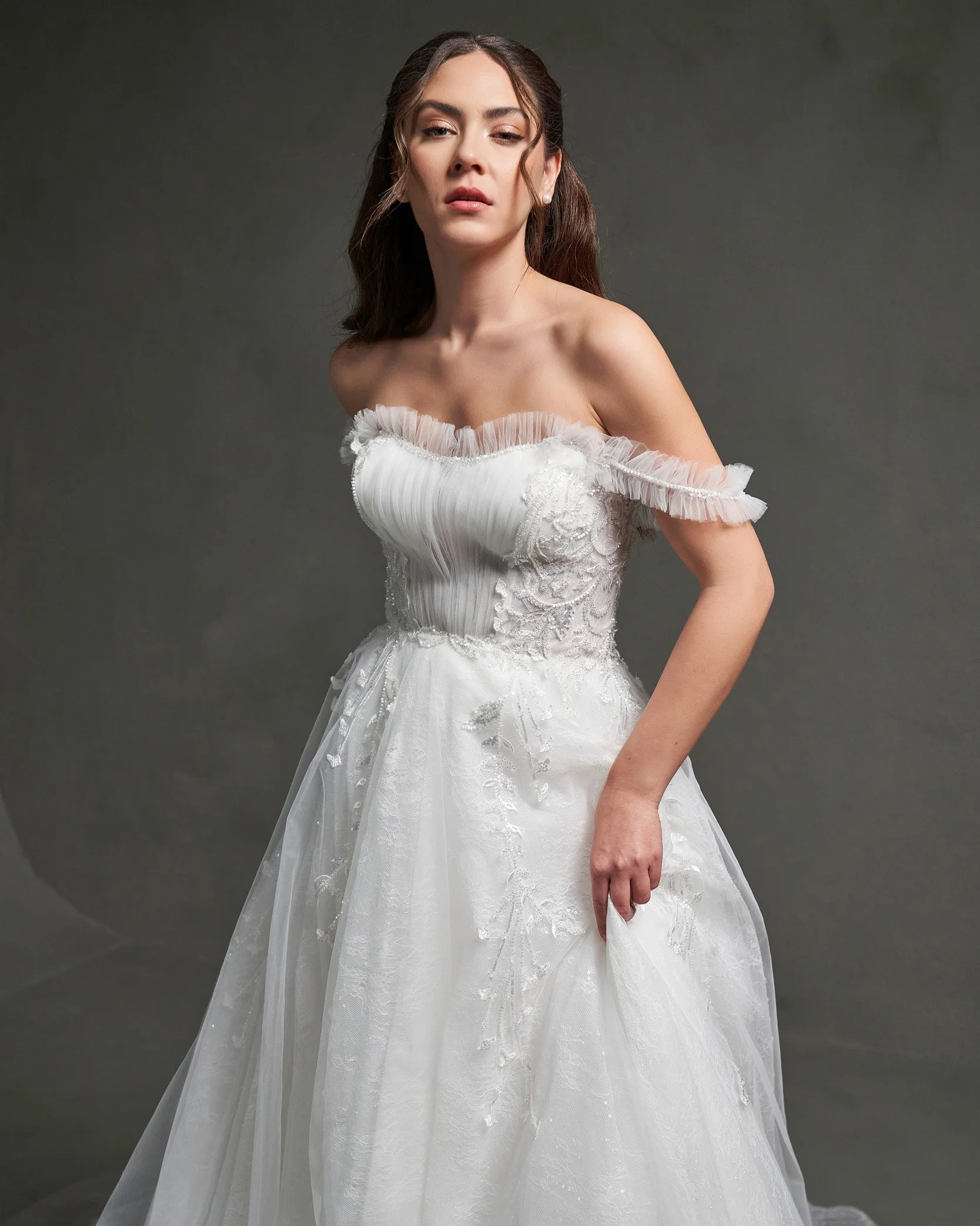 The Iris Gown is a celebration of delicate beauty and rich detail. Featuring soft tulle, floral embellishments, and subtle sparkle, this gown is designed to capture light with every step. The off-the-shoulder draped tulle and structured bodice create a harmonious blend of ethereal softness and refined luxury.