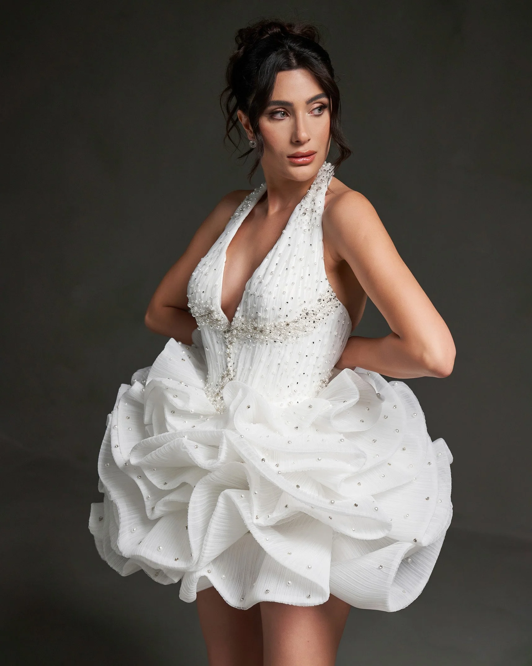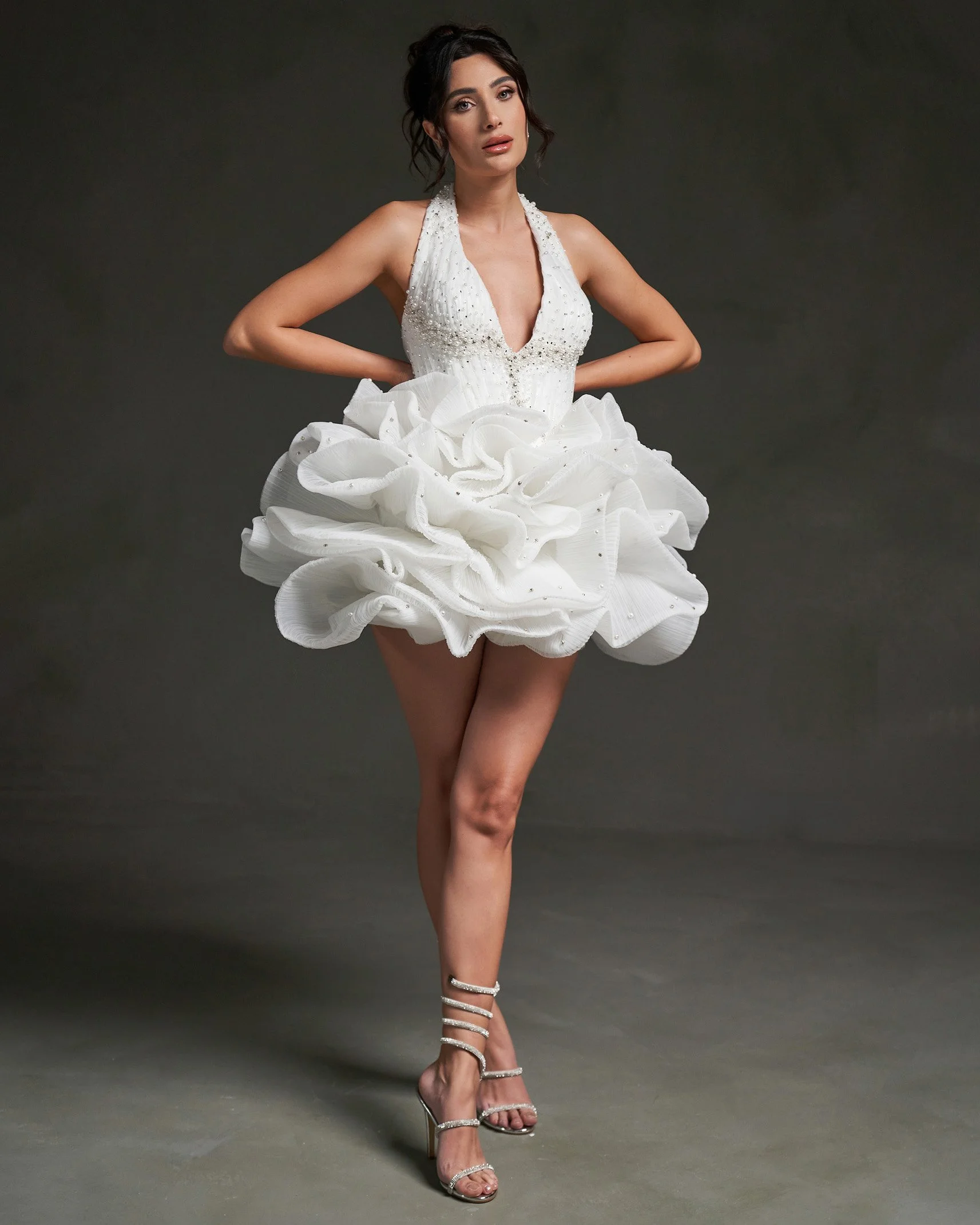 The Brigitte gown is inspired by the timeless allure of Brigitte Bardot – bold, glamorous, and unapologetically feminine. This halter-style mini dress features a pearl-embellished bodice that cascades into a voluminous, petal-like skirt. A nod to 60s couture with a modern twist, Brigitte is for the bride who wants to exude confidence and charm.