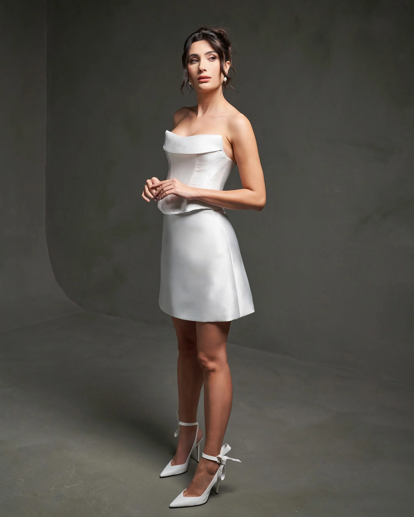 The Colette gown redefines bridal elegance with a contemporary edge. This structured mini dress features a sculpted satin corset bodice that highlights the waist, paired with a clean, A-line skirt. The off-shoulder draped neckline adds subtle softness to the bold silhouette, creating a balance of sophistication and charm. Perfect for a reception look or a fashion-forward statement, Colette is designed for the bride who dares to stand out.