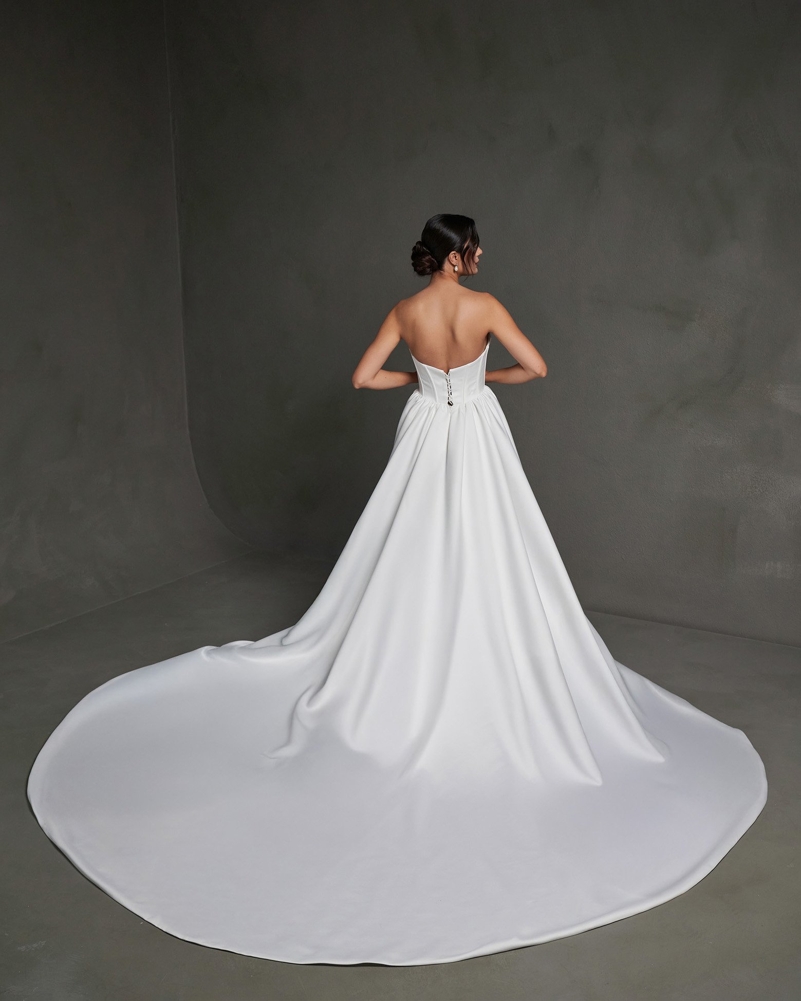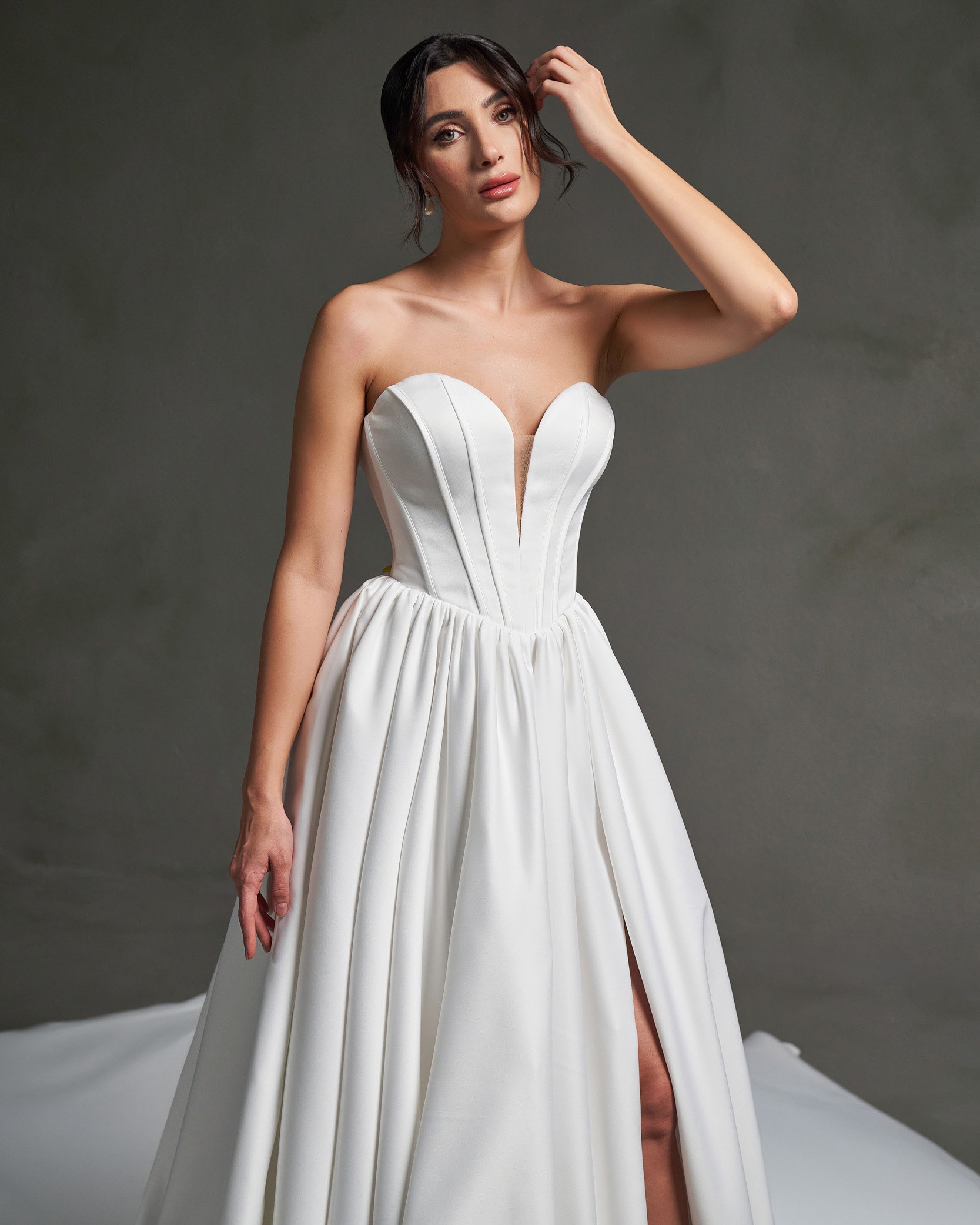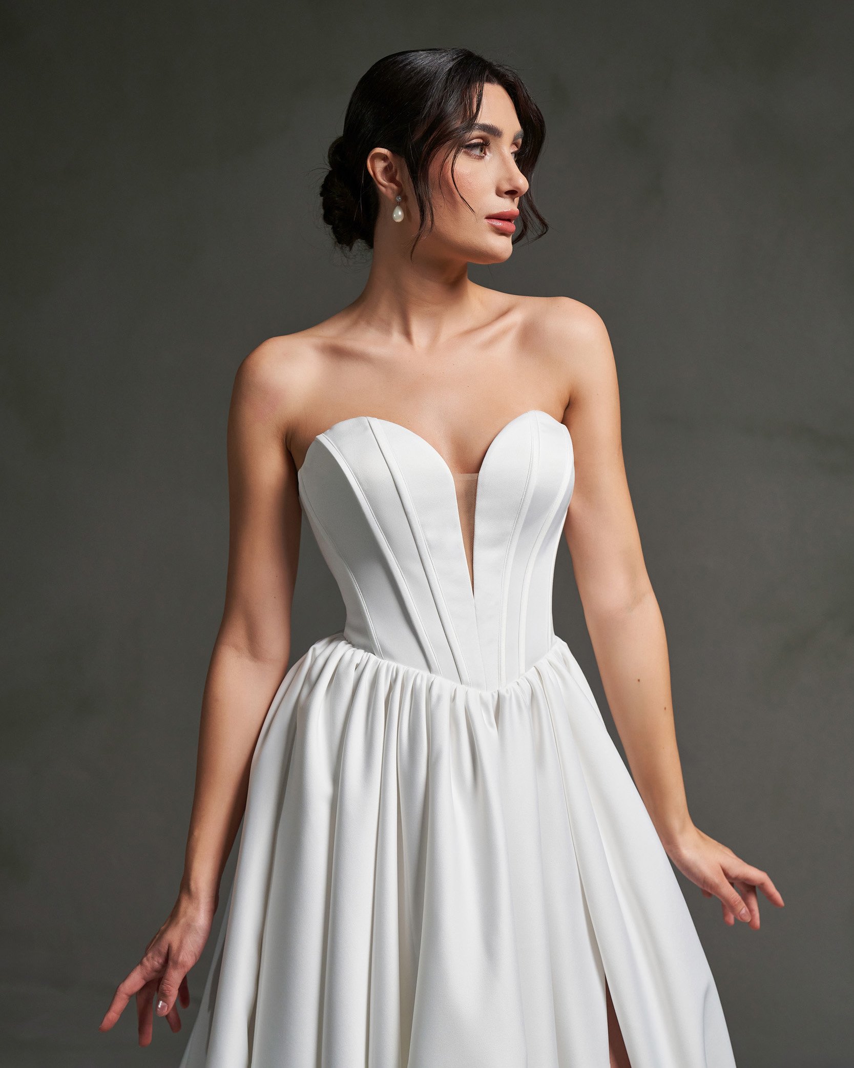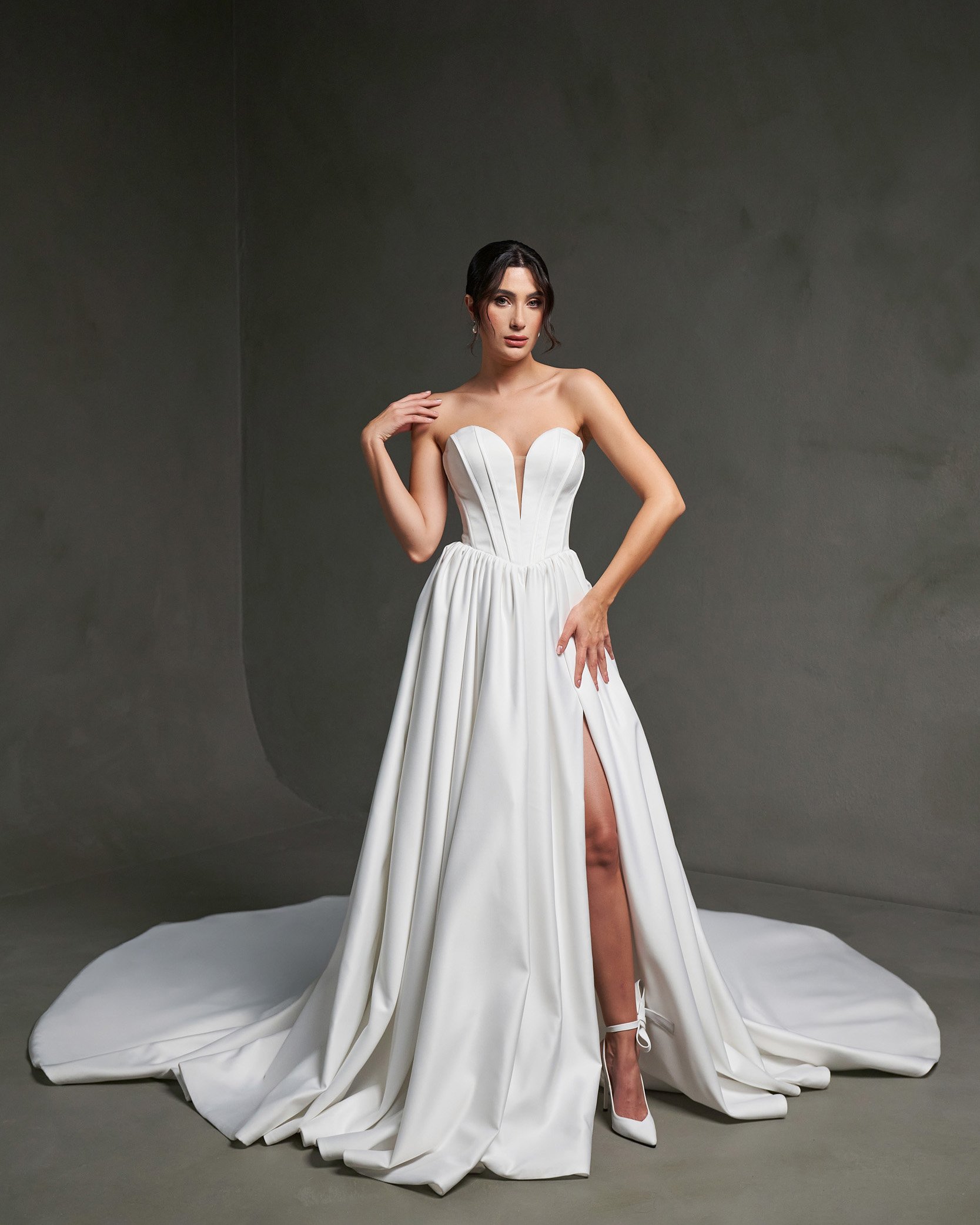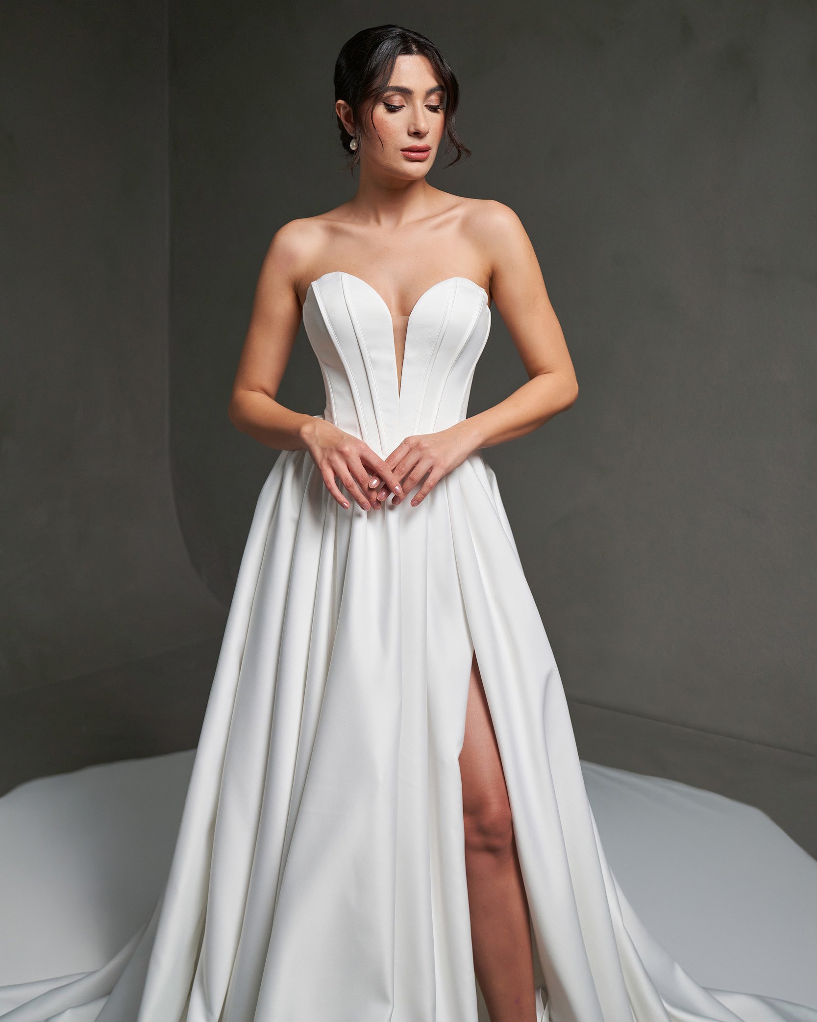 Step into timeless sophistication with the Aurora Gown, a design that redefines modern bridal wear. The structured corset bodice creates a sculpted silhouette, flowing into a full skirt with soft pleats and a daring slit for movement. Clean lines and minimal embellishments allow the craftsmanship to speak for itself, offering understated luxury.