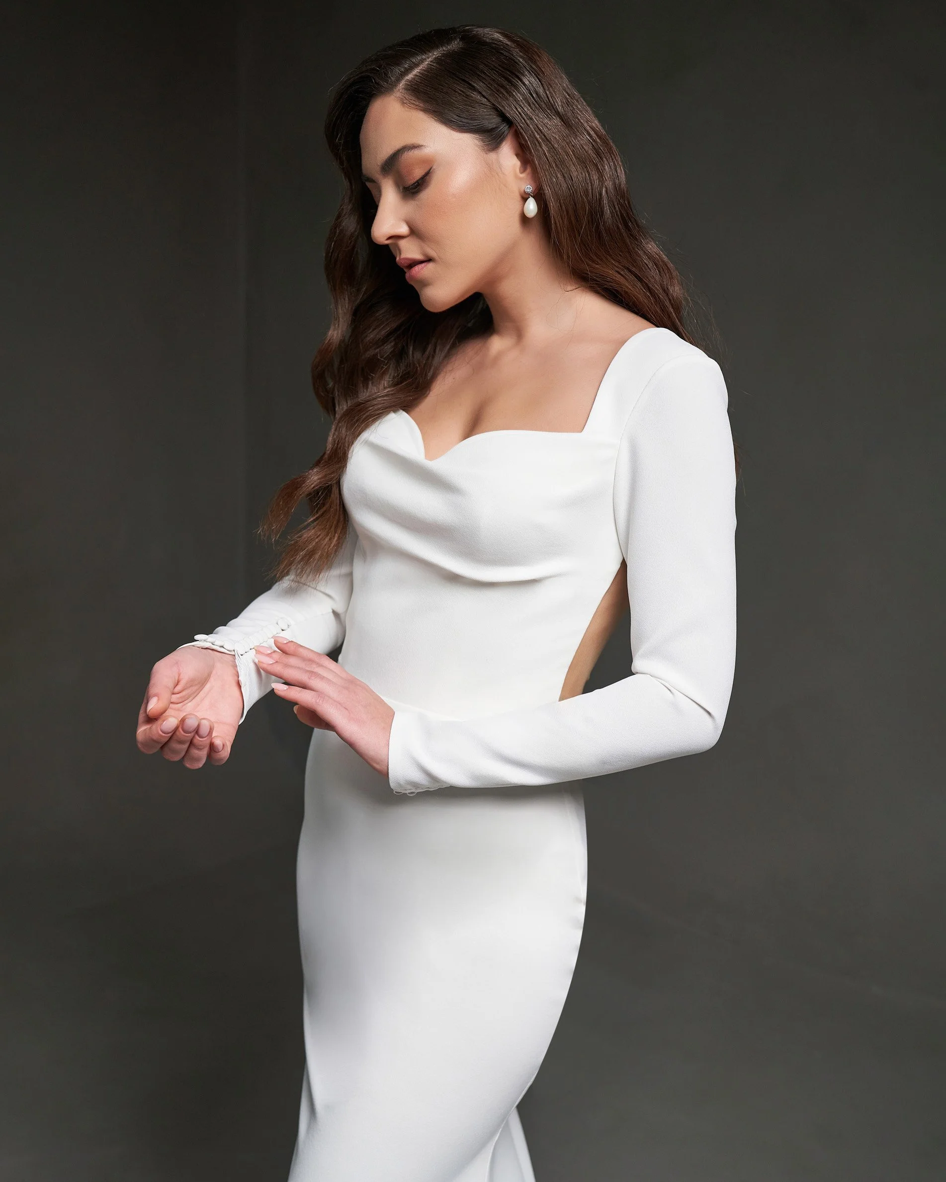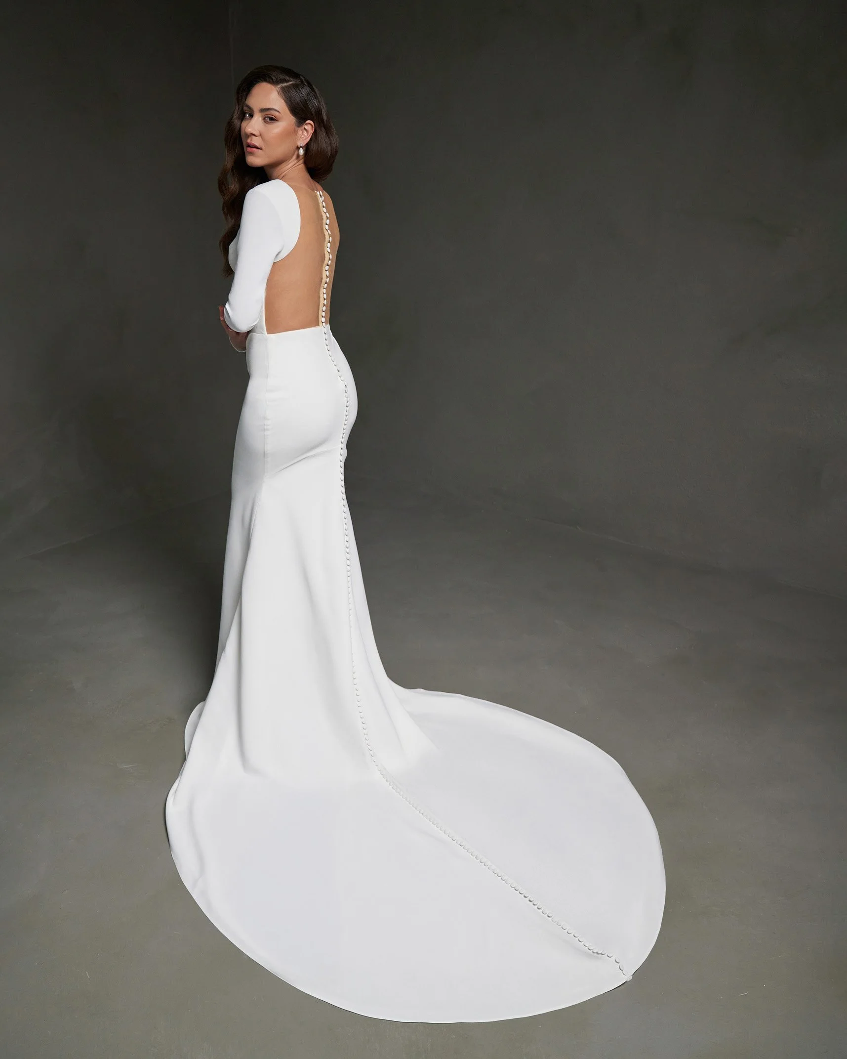 The Orchid gown exudes sleek sophistication, embodying the delicate beauty of its namesake flower. Crafted from smooth crepe, this long-sleeved dress features a refined square neckline with soft draping and a striking open back framed by cascading buttons. The fitted silhouette flows effortlessly into a dramatic train, creating a vision of modern grace and timeless allure. Orchid is designed for the bride who values simplicity with a touch of boldness.